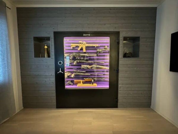 Model 1709 - Pantzerglass Finland — dit is een ruime wapenkluis voor lange en korte wapens, met twee munitiekluizen. Wapenkluis klasse S1 met een deur voorzien van gelaagd/kogelwerend veiligeheid glas, inbraakwerend 24 mm. Grote wapenruimte met Slatwall-systeem, geschikt voor een flinke collectie (mogelijkheid om houders voor verticale of horizontale bevestiging van wapens bij te kopen). Externe scharnieren waarmee de deur tot 180 graden geopend kan worden.